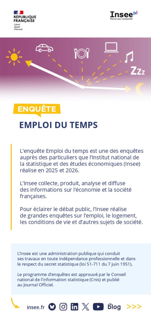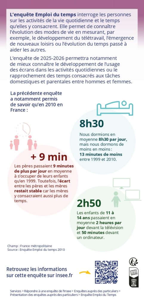 L’enquête 2025-2026 vise également à approfondir certains sujets, tels que le développement de l’usage des écrans dans les activités quotidiennes, ou encore le temps de travail non rémunéré, qu’il s’agisse du temps passé à s’occuper de sa famille, d’aide à des proches ou d’un engagement bénévole.