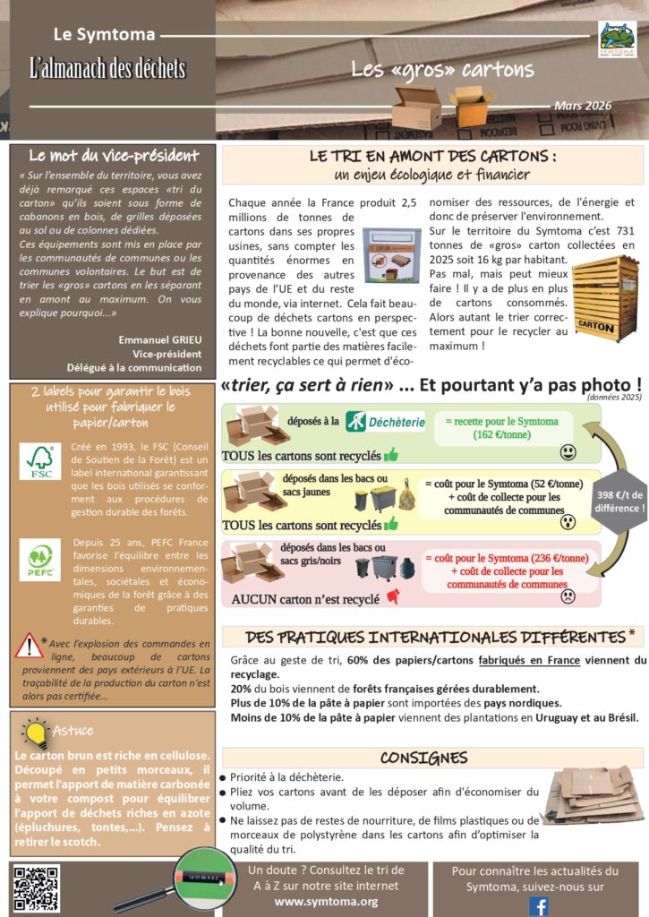 Sur le territoire du Symtoma, 731 tonnes de « gros » cartons ont été collectées en 2025, soit 16 kg par habitant. Un résultat encourageant… mais perfectible ! La consommation de cartons ne cesse d’augmenter ; il est donc essentiel de les trier correctement afin d’optimiser leur recyclage.
